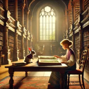 Am nächsten Morgen machten sich Philomena und Frænk mit dem alten Tagebuch auf den Weg in die Bibliothek des Schlosses. Sie wussten, dass sie dort in Ruhe die Geheimnisse des Buches erkunden konnten. Die Bibliothek war ein großer Raum voller Regale, die bis zur Decke reichten, und die Morgensonne fiel in sanften Strahlen durch die hohen Fenster und beleuchtete den Staub, der in der Luft schwebte. Die Atmosphäre war ruhig und einladend – genau der richtige Ort, um ein altes Geheimnis zu erforschen.